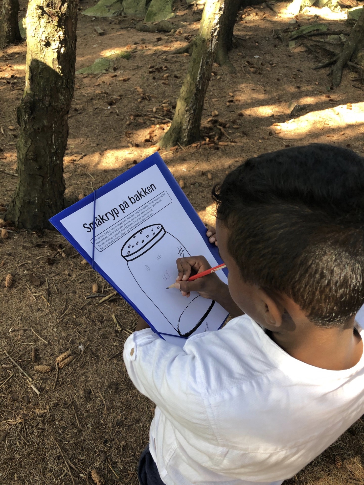 I dag har 3. trinn hatt naturfag i skogen. Målet var å undersøke og finne ut hvilke småkryp vi hadde i nærmiljøet. Elevene skrev ned og tegnet det de fant.